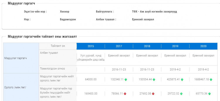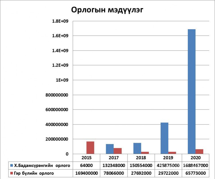 Тухайлбал 2015 онд 64 сая төгрөгийн орлоготой хэмээн мэдүүлж байсан бол 2017 онд 132 сая, 2018 онд 150 сая, 2019 онд 425 сая 875 мянга, 2020 онд 1 тэрбум 688 сая 467 мянган төгрөг болж суга өсчээ.