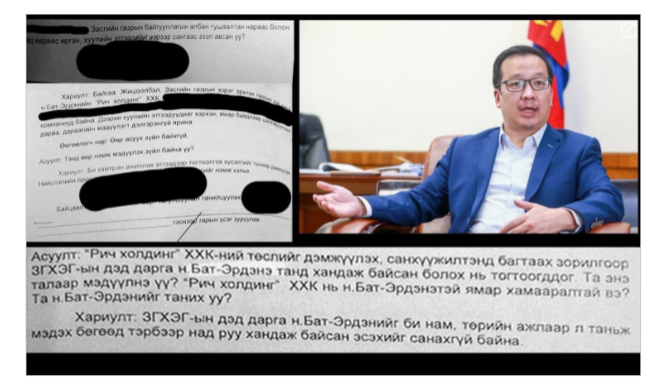 Тодруулбал, ХХААХҮ-ийн сайд асан Б.Батзоригоос АТГ-ын мөрдөгч “… “Рич Холдинг” ХХК-ийн төслийг дэмжүүлэх, санхүүжилтэд багтаах зорилгоор ЗГХЭГ-ын дарга н.Бат-Эрдэнэ танд хандаж байсан болох нь тогтоогддог. Та энэ талаар мэдүүлнэ үү. “Рич Холдинг” ХХК нь н.Бат-Эрдэнэтэй ямар хамааралтай вэ. Та н.Бат-Эрдэнийг таних уу” гэж асуужээ. Ингэхэд сайд асан Б.Батзориг “ЗГХЭГ-ын дэд дарга н.Бат-Эрдэнийг би нам, төрийн ажлаар л таньж мэдэх бөгөөд тэрээр над руу хандаж байсан эсэхийг санахгүй байна” гэж хариулсан байна.