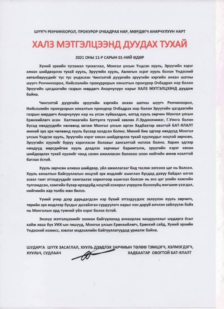 Дээрх нэр бүхий шүүгч, прокурор, мөрдөгчид үгсэн хуйвалдах замаар илтэд хууль зөрчиж Монгол Улсын Ерөнхийлөгч асан Х.Баттулга, түүний зөвлөх Л.Эрдэнэчимэг, Г.Уянга болон бусад этгээдүүдийн нөлөөнд автаж Монгол Улсын иргэн Х.Бат-Ялалтын эрх, эрх чөлөөнд хууль бусаар халдсан хэмээн үзэж байгаа аж.