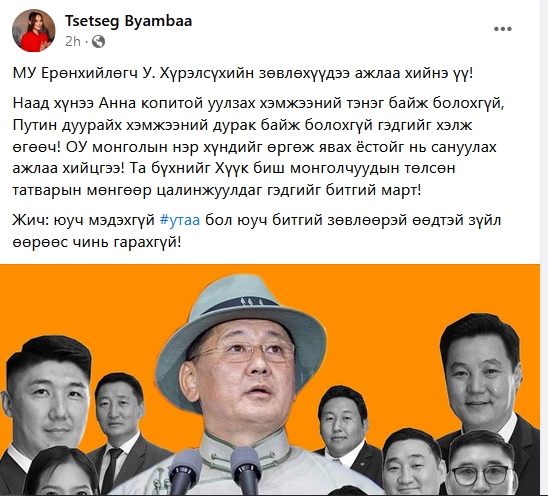 Наад хүнээ Анна копитой уулзах хэмжээний тэнэг байж болохгүй, Путин дуурайх хэмжээний дурак байж болохгүй гэдгийг хэлж өгөөч! ОУ монголын нэр хүндийг өргөж явах ёстойг нь сануулах ажлаа хийцгээ! Та бүхнийг Хүүк биш монголчуудын төлсөн татварын мөнгөөр цалинжуулдаг гэдгийг битгий март!