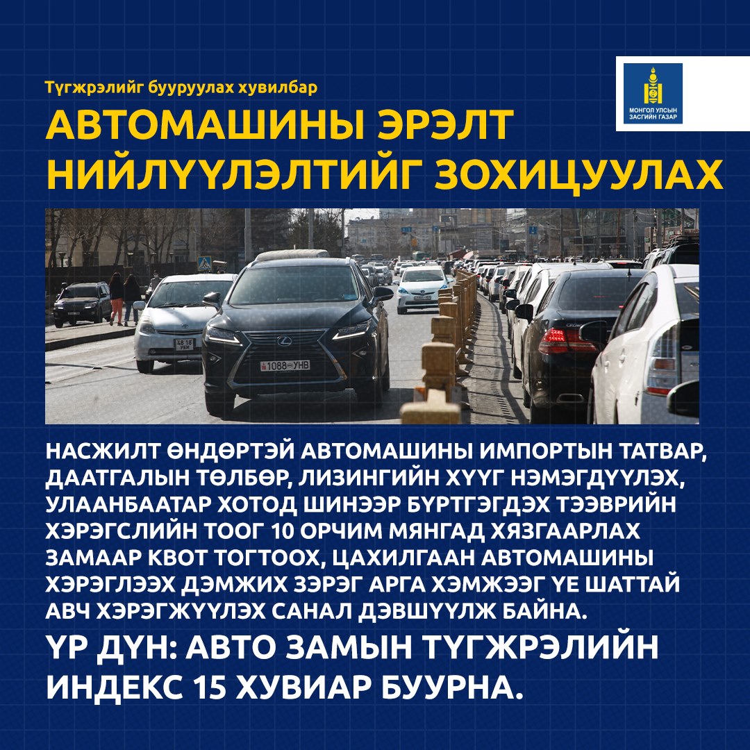 Түүнчлэн хос хөдөлгүүртэй автомашины татварын хөнгөлөлтийг цуцлах, буруу талдаа жолооны хүрдтэй автомашиныг замын хөдөлгөөнд оролцохыг хориглох, шатахууны үнэд нийслэл хотын 1% татвар тооцох, цахилгаан автомашины хэрэглээх дэмжих зэрэг арга хэмжээг үе шаттай авч хэрэгжүүлэх санал дэвшүүлж байна.