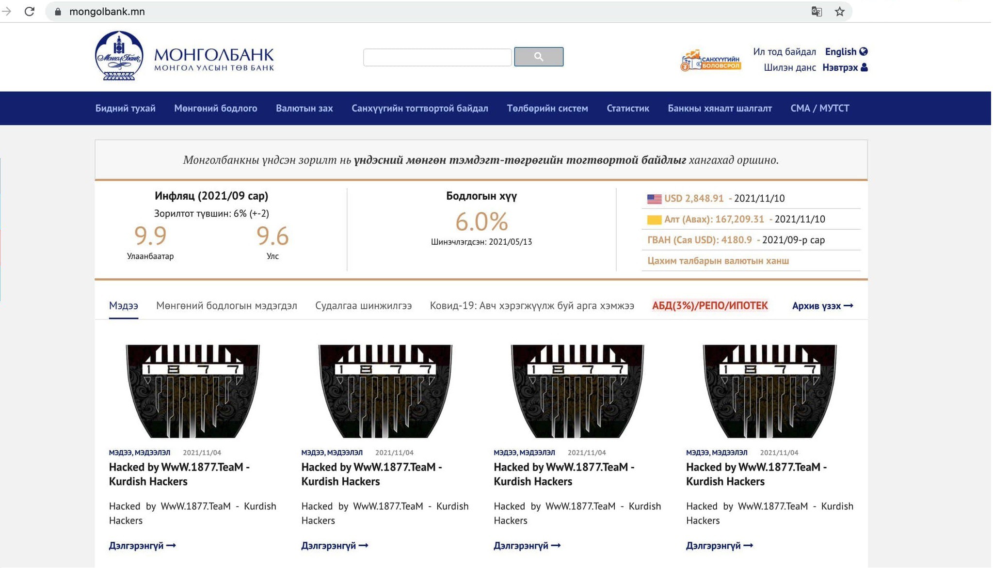 Тодруулбал, Төв банкны веб сайтад хандах үед байршуулсан мэдээллүүдийн гарчиг “Hacked by WwW.1877.TeaM – Kurdish Hackers” гэх байдлаар өөрчлөгдөж, “Thumbnail” зургууд нь өөрчлөгджээ. Кибер халдлага үйлдэгчид амжилттай халдлага үйлдсэн болохоо батлах зорилгоор ийм төрлийн “мэдэгдлийг” үлдээдэг. Улмаар Монголбанкны вебсайтад одоогоор хандах боломжгүй байгаа юм.