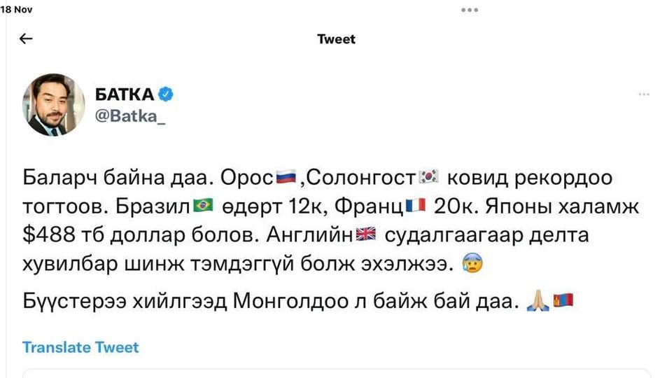 Тэрбээр, “ОХУ, БНСУ-д ковидын тархалт дээд хэмжээндээ хүрч байгааг онцлоод Бразил өдөрт 12 мянга, Франц 20 мянган тохиолдол шинээр бүртгэгдэж байгаа бөгөөд ковидын нөлөөгөөг Япон улсын халамжид зарцуулж буй мөнгөн дүн 488 тэрбум долларт хүрч байгааг онцлоод хамгийн сүүлд Англи улсын хийсэн судалгаагаар делта хувилбар ямар нэг шинж тэмдэггүй болж байна” хэмээн хэлжээ.