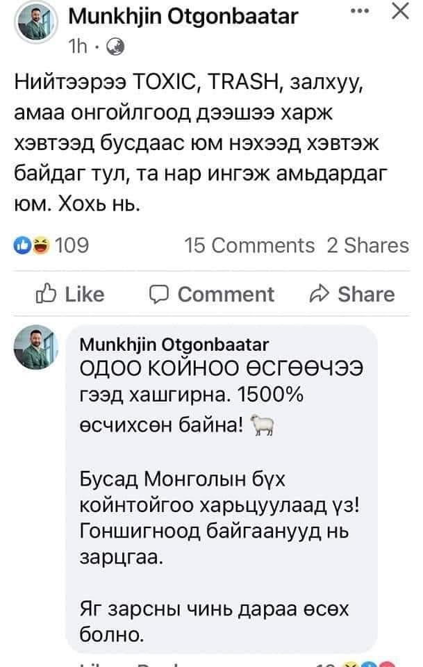 Түүний талаар: Бүүр нэг аархсан, доромжилсон, дээрээс харьцсан дээрэлхсэн ийм нөхөд ч дээ. Аливаа бизнест ёс зүй, хүнд төлөвшил, ухамсар гэж байх ёстой. Баахан мөнгө босгож аваад үнэтэй байр, машин авлаа гэж сонсогддог нөхдийг хэрэг үүсгэн шалгах хэрэгтэй‼ Цагдаагийн ерөнхий газар Эдийн засгийн гэмт хэрэгтэй тэмцэх газраас шалгах хэрэгтэй.