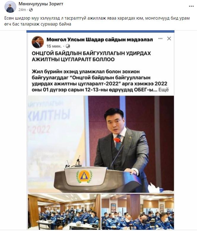 Төрийн түшээ, яамны сайдаар ажиллаж байсан М.Зоригт олон нийтийн сүлжээнд идэвхтэй, тэр хэрээрээ хэлэх гэсэн үгээ шулуухан хэлж, байр сууриа илэрхийлчихдэг гүндүүгүй эрчүүдийн нэг. Тэрбээр өөрийн нүүр хуудастаа монголчууд нэгэндээ урам өгч сураасай гэсэн уриалгыг гаргажээ.. Тодруулбал, “Есөн шидээр муу хэлүүлээд л тасралтгүй ажиллаж яваа харагдах юм, монголчууд бид урам өгч бас талархаж сурмаар байна” гэжээ.