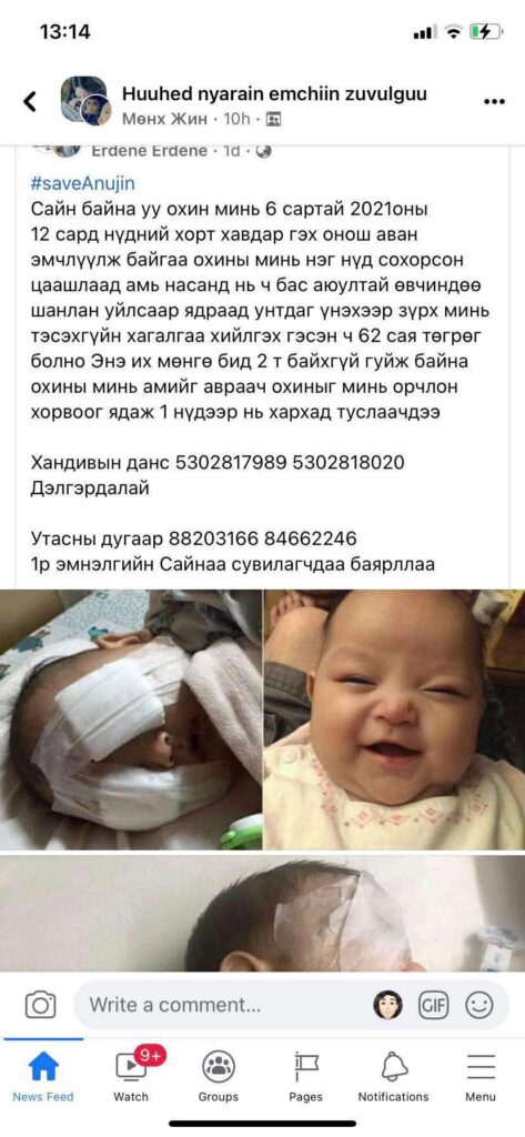 Цахим орчинд “Erdene Erdene” гэсэн фэйсбүүк хаягнаас хоёр нүдний өвчтэй бага насны хүүхдийн зургийг тавьж эмчилгээний зардалд мөнгө хандивлахыг уриалсан постыг та доорх зурагнаас харж байна.