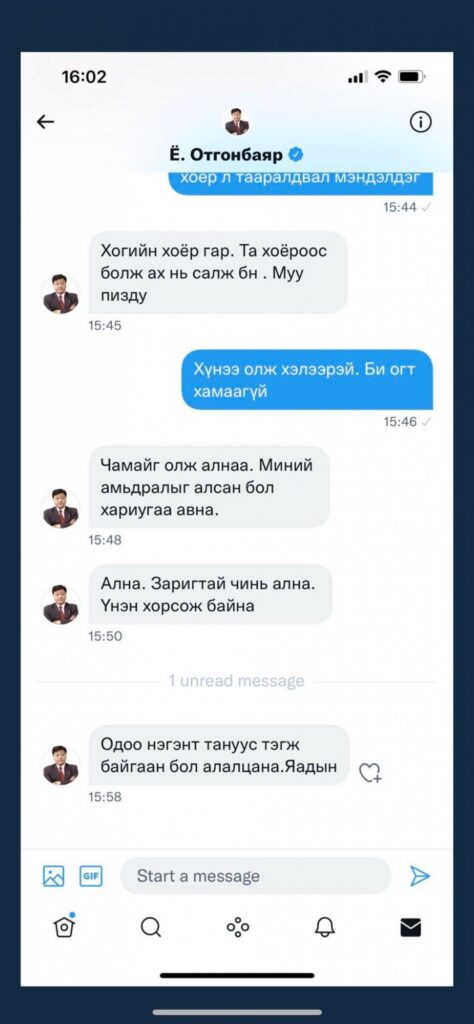 Тэгвэл тэрээр өнөөдөр өөрийн албан ёсны твиттер хуудсаараа сэтгүүлчийг ална гэж сүрдүүлсэн захидал илгээсэн тухай сэтгүүлч У.Оргилмаа дэлгэлээ.