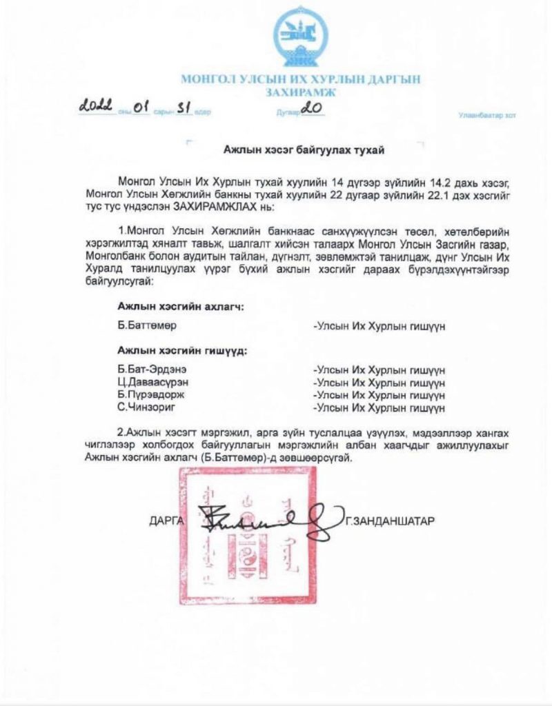 Хөгжлийн банкийг шалгах ажлын хэсгийн бүрэлдэхүүнээс Ч.Хүрэлбаатар, Б.Энхбаяр нар татгалзсан. Б.Энхбаярын хувьд Хууль зүй, дотоод хэргийн дэд сайдаар ажиллаж байхдаа Хөгжлийн банкинд шалгалт хийж, АН-ынхныг аавын хаалга татахад ихээхэн хувь нэмэр оруулсан нэгэн. Хөгжлийн банк хөгжлийн бэрхшээлтэй болж, хасах үзүүлэлттэй болсныг ч чуулганы хуралдаан дээр тайлагнан лүндэгнэж байсан ч энэ удаагийн шалгалтын ажлын хэсгээс татгалзсан нь Сү.Батболдын даалгавар гэлцэж байгаа.