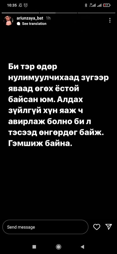 Мөн дараа нь “Би тэр өдөр нулимуулчихаад зүгээр яваад өгөх байсан юм. Алдах зүйлгүй хүн яаж ч авирлаж болно. би л тэсээд өнгөрдөг байж. Гэмшиж байна.