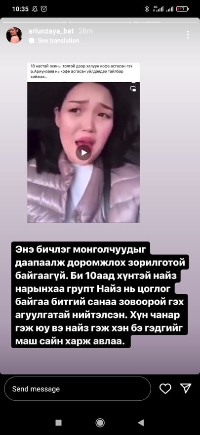 Энэ бичлэгийг монголчуудыг даапаалж доромжлох зорилготой байгаагүй. Би 10-аад хүнтэй найз нарынхаа группт найз нь цоглог байгаа надад битгий санаа зовоорой гэх агуулгатай нийтэлсэн. Хүн чанар гэж юу бэ найз гэж хэн бэ гэдгийг маш сайн харж авлаа” гэжээ.