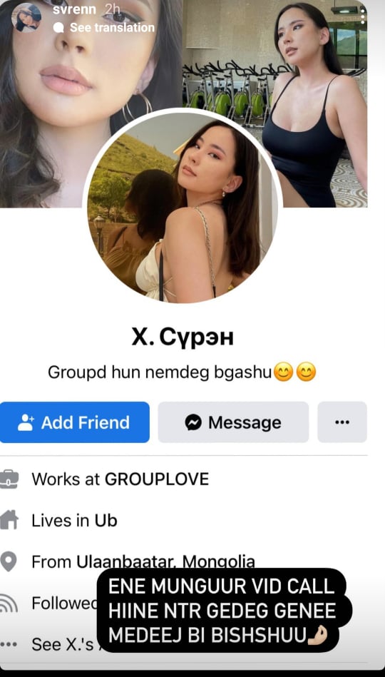 Тэрээр “мөнгөөр video call хийнэ нтр гэнээ. Мэдээж би биш шүү”гэжээ. Дашрамд дуулгахад Фэйсбүүк орчинд са д ар са м у уныг сурталчилсан группуудэд эмэгтэй хүний зураг ашигласан хуурамч хаягаар “Video call хийнэ”, “Видео чат” хийнэ гэх мэт утгатай зар байршуулж, урьдчилгаа мөнгө авах замаар бусдыг залилан мэхэлдэг, мөн хохирогч өөрийн жинхэнэ хаягаар харилцсан тохиолдолд бичсэн чат мэдээлэл болон илгээсэн зураг зэргийг гэр бүл, найз нөхөд рүү тараана гэх мэтээр мөнгө нэхэн заналхийлэх үйлдэл их байгаа юм.