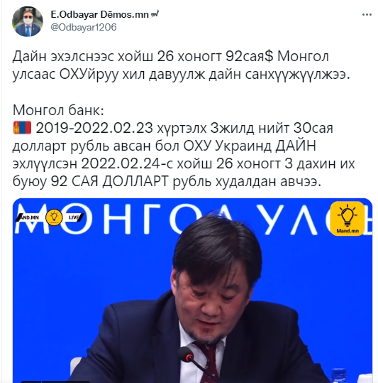 Тэгвэл өчигдөр /2022.03.22/ Монголбанкны Ерөнхийлөгч Б.Лхагвасүрэн мэдээлэл хийх үеэрээ, “2019 оноос хойш өнөөдрийг хүртэл хамгийн дээд тал нь 30 сая ам.доллартай тэнцэх хэмжээний рублийн арилжаа хийгддэг байсан бол, энэ оны 2 дугаар сарын 24-ны өдрөөс хойш 92 сая ам.доллартай тэмцэх хэмжээний рублийн арилжаа хийгдсэн байна” гэж мэдэгдсэн.