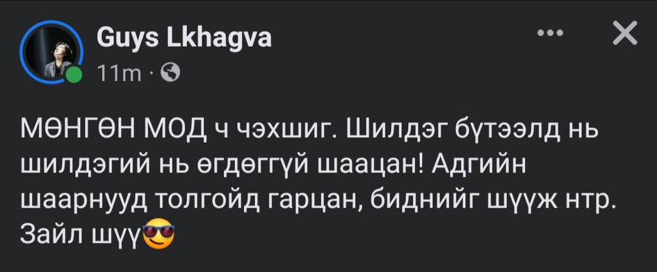 Дээшээ гарах нэгнээ үргэлж араас нь татаж байдаг. Новшнууд нь хэтэрхий их болжээ. Энэ новшнуудыг даръя аа арай л дээрэлхүүлж амьдраад бна шүү. Шударга сайхан сэтгэлтэй хүмүүс минь одоо наад новшнуудаа өршөөж уучлахаа боль! Ална шүү зайл гэж хэл наад новшнууддаа!!”гэв.