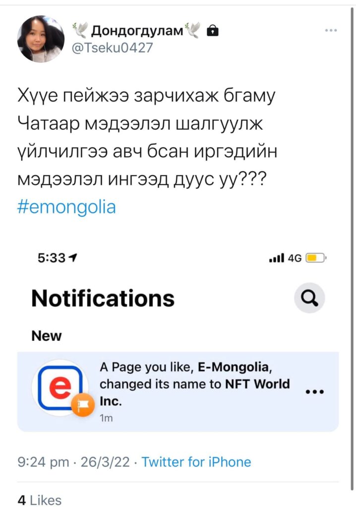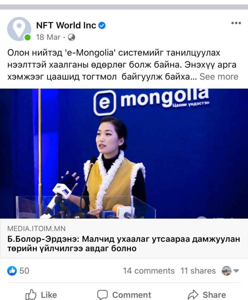 Гэвч И-Монголиагийн фэйсбүүк хаягийг гаднын иргэд хакерджээ. Тэд хаягийг NFT World Inc болгон өөрчилж, NFT-тэй холбоотой мэдээлэл оруулсан байна.