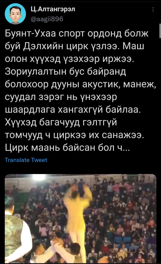 Буянт-Ухаа бол нэг л тийм тухгүй байлаа. Буянт-Ухаа спорт ордонд болж буй Дэлхийн цирк үзлээ. Маш олон хүүхэд үзэхээр иржээ. Зориулалтын бус байранд болохоор дууны акустик, манеж, суудал зэрэг нь үнэхээр шаардлага хангахгүй байлаа. Хүүхэд багачууд гэлтгүй томчууд ч циркээ их санажээ. Цирк маань байсан бол ч…,