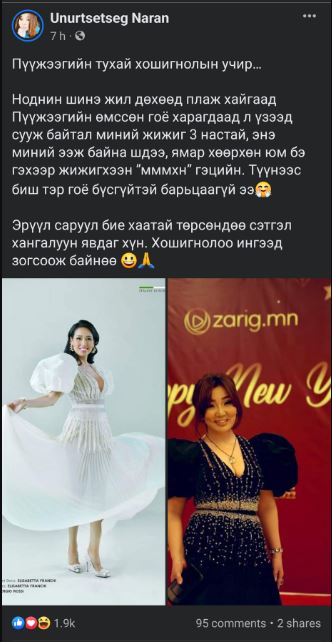 Ноднин шинэ жил дөхөөд плаж хайгаад Пүүжээгийн өмссөн гоё харагдаад л үзээд сууж байтал миний жижиг 3 настай, энэ миний ээж байна шдээ, ямар хөөрхөн юм бэ гэхээр жижигхээн ”мммхн” гэцийн. Түүнээс биш тэр гоё бүсгүйтэй барьцаагүй ээ. Эрүүл саруул бие хаатай төрсөндөө сэтгэл хангалуун явдаг хүн. Хошигнолоо ингээд зогсоож байнөө.