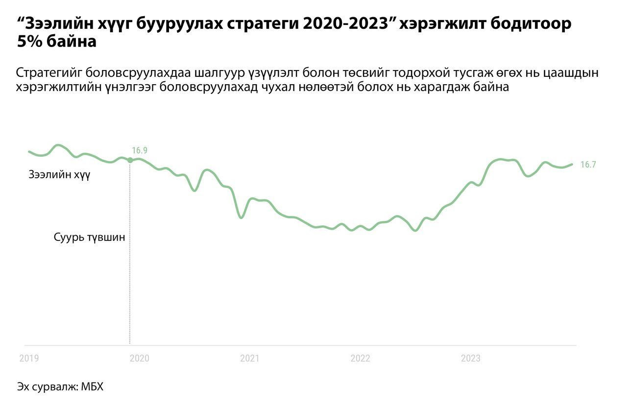 2020 онд УИХ-аас баталсан Зээлийн хүү бууруулах стратегид 2023 онд зээлийн хүүг сарын нэг хувьд буюу жилийн 12 хувьд хүргэх зорилтыг тусгасан юм. Өнгөрсөн оны жилийн эцсийн байдлаар зээлийн дундаж хүү 16.7 хувьтай гарсан нь стратегийн хэрэгжилт нэлээд хангалтгүй байсныг харуулж байна. Хадгаламж, зээлийн хүү өндөр хэвээр хадгалагдахад төсвийн хэт тэлэлт, түүнийг дагасан төсвийн алдагдал нөлөөлж буйг Монголын банкны холбоо онцолж байлаа.