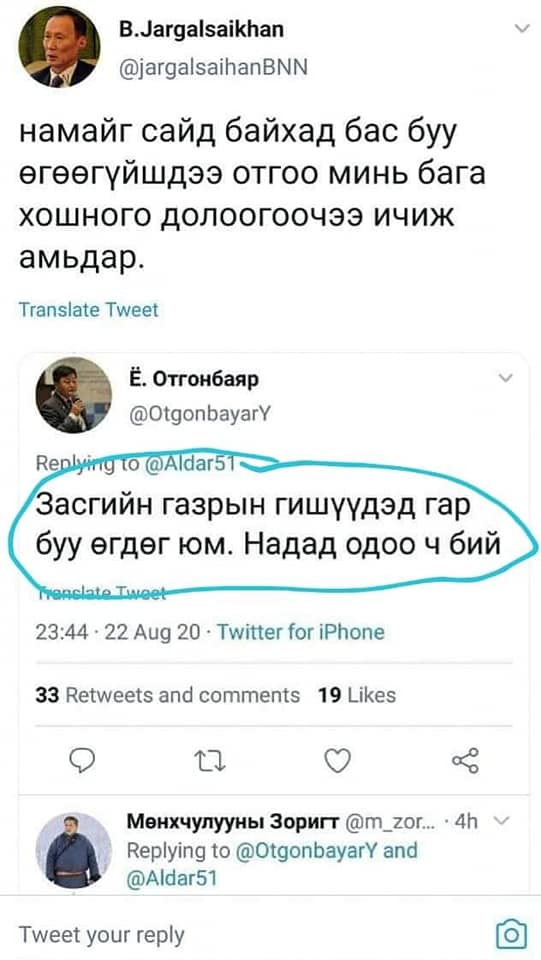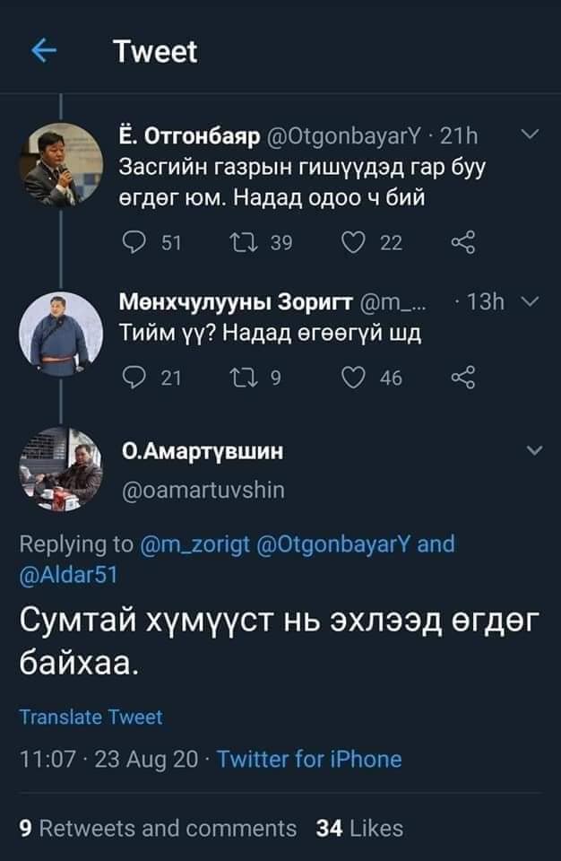 Тухайлбал, Зам тээврийн сайд асан М.Зоригт, түүний жиргээнд, “Тийм үү, надад өгөөгүй шдээ” хэмээн хариулсан бол нэгэн цагт Үйлдвэр худалдааны сайдаар ажиллаж байсан БНН-ын дарга Б.Жаргалсайхан Ё.Отгонбаярын жиргээнд “Намайг сайд байхад бас буу өгөөгүй шдээ. Отгоо минь бага хошного долоогооч ээ, ичиж амьдар” хэмээн бичиж эгдүүцлээ илэрхийлжээ.